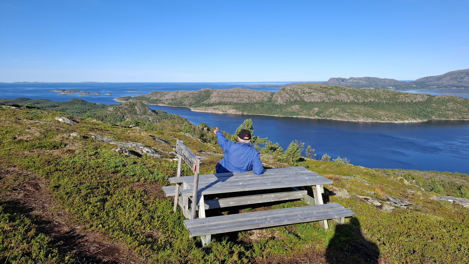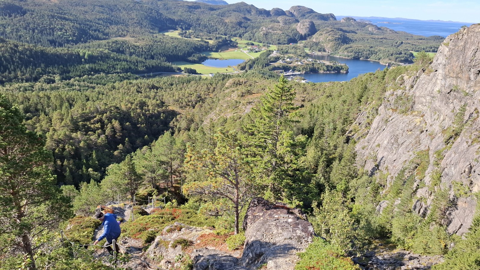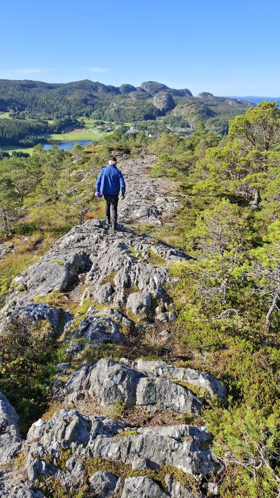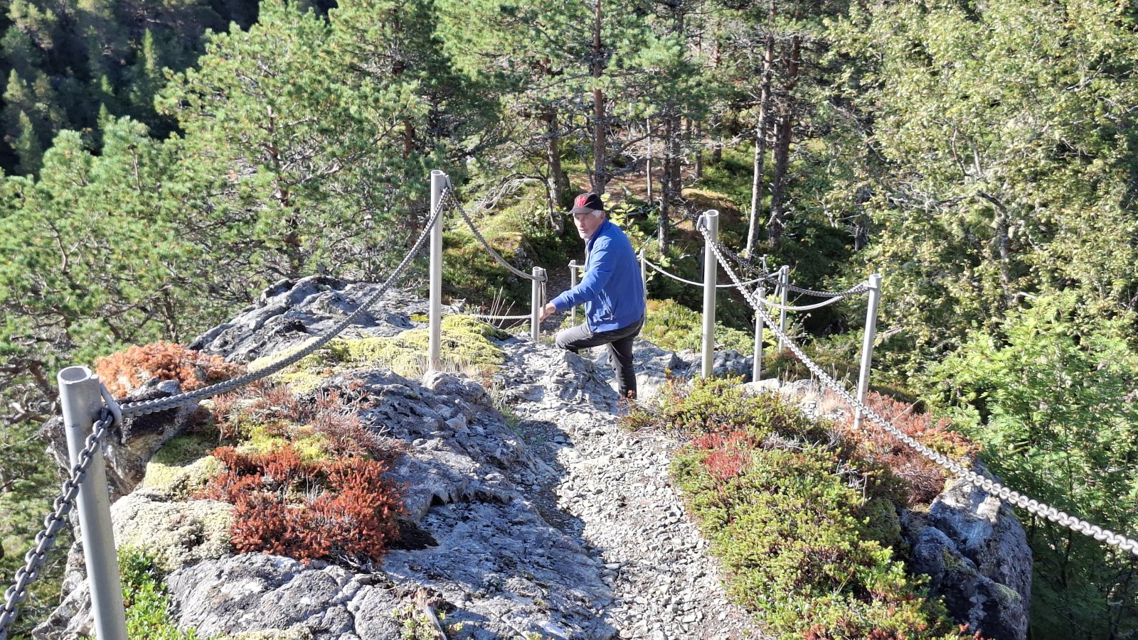 Postupujeme pomaly. Niet sa kam ponáhľať. Určite na chatu prídeme skôr, ako chlapi z mora. Aj tak bolo. A dopredu prezradím, že sme neľutovali. My sme mali zážitky, výhľady a všeličo iné. Oni veľa toho nezachytali. Počasie bolo nádherné, na turistiku je to vždy dobre, na more to tak nemusí byť. Ale to je iná téma. Trasa nie je dlhá. Síce Nóri píšu, že je to stredná obtiažnosť, ale ak je pekné počasie, nie je mokro, alebo primrznuté, tak je to pohoda. Prichádzame na vrchol. Konečne som tú rozhľadňu objavil. Je iná, ako naše rozhľadne. Naše sa väčšinou stavajú do výšky, aby bolo vidieť ponad stromy, či iné prekážky. Táto? Ani jeden schod. Lenže tu býva veterno a aj počasie sa dokáže zmeniť behom chvíľky. Viac chráni pred počasím, ako by zlepšovala výhľady. Je to moja prvá rozhľadňa v Nórsku, tak ani neviem povedať, či je bežnou súčasťou fotodokumentácia s metličkou a lopatkou…