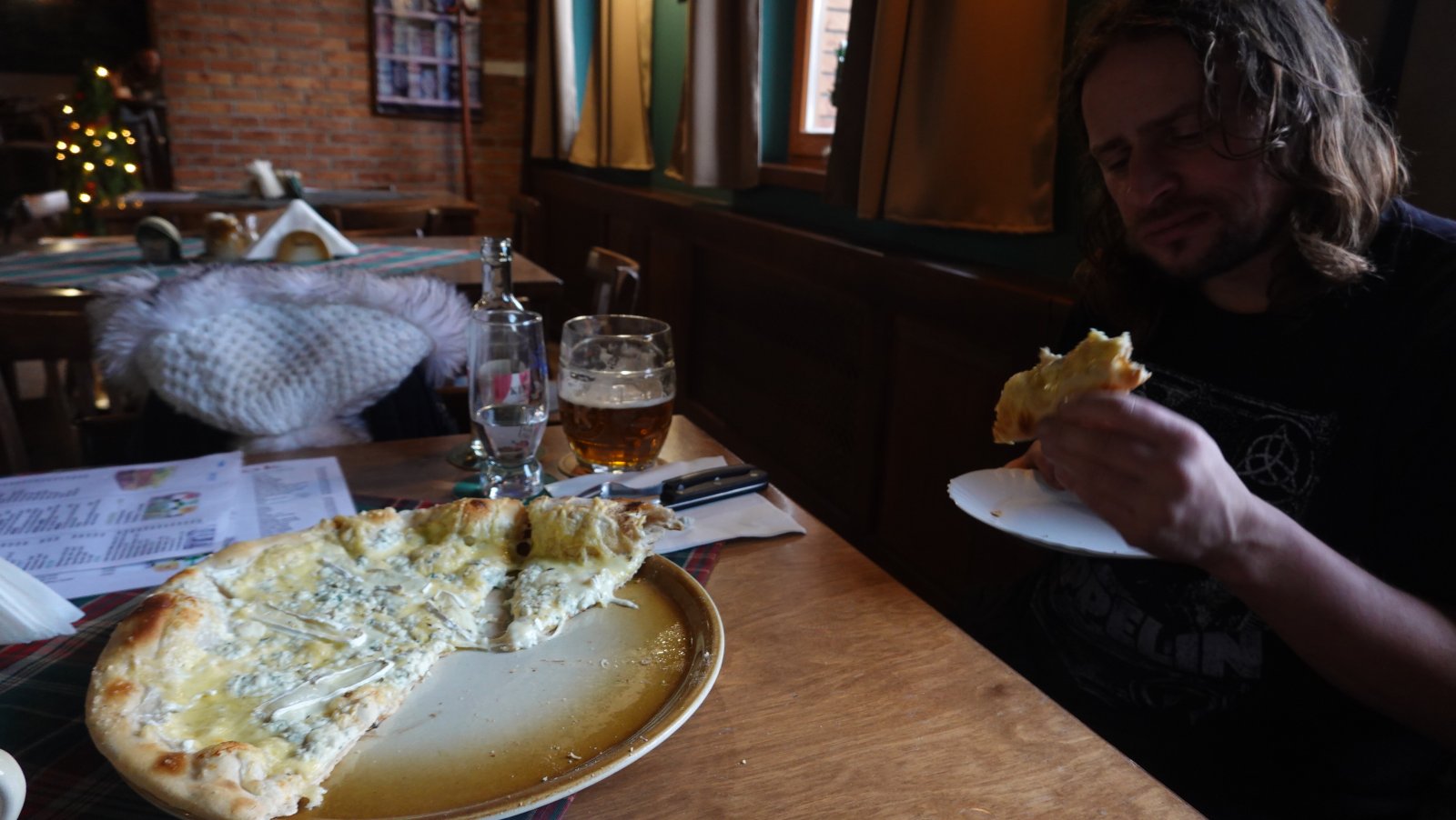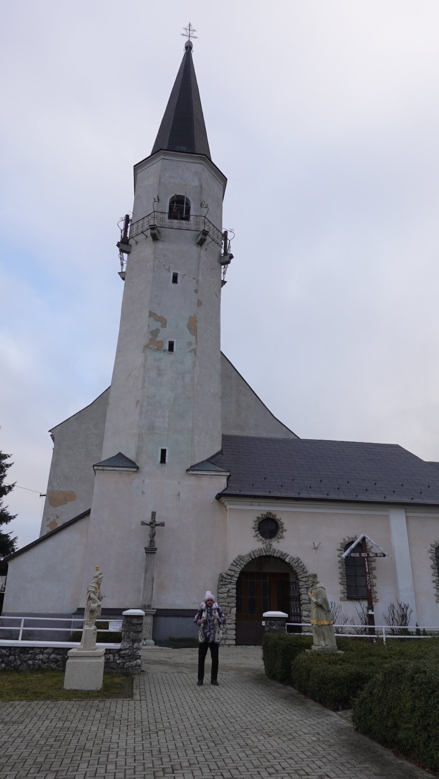 Parkujeme neďaleko kostola. Dalo by sa aj bližšie k nášmu cieľu, ale nechce sa nám nakoniec ísť hore kopcom s plnými žalúdkami. Plánujeme totiž navštíviť šenček a dať si pizzu. A akurát už ideme okolo parkoviska. Je tu zaparkovaných už relatívne dosť áut, ale možno práve kvôli počasiu by sa tu dalo dnes zaparkovať aj po desiatej hodine. A už aj niekto ide. Bežci sa vracajú späť. To kedy vstávali? Čo ich medveď naháňal?